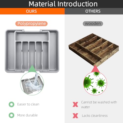 - 【مادة فاخرة آمنة غذائيًا】: منظم الأواني الفضية البلاستيكي مصنوع من مادة البولي بروبيلين الممتازة والقوية والمتينة والآمنة غذائيًا لذلك فهو آمن بنسبة 100% لتخزين جميع أدوات المطبخ. يحافظ على صحتك أنت وعائلتك طوال الوقت.