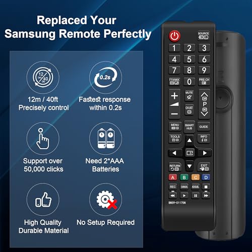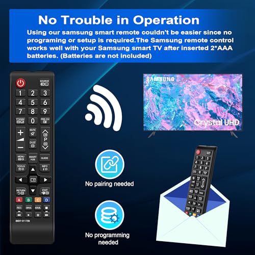 - 【سهل الاستخدام】جهاز تحكم عن بعد عالمي بسيط من سامسونج، حجم صغير وصغير يجعل جهاز التحكم عن بعد هذا سهل الإمساك ولا ينزلق بسهولة. يعمل مباشرة بمجرد إخراجه من الصندوق، جهاز تحكم عن بعد بالأشعة تحت الحمراء لا يحتاج إلى اقتران ما عليك سوى إدخال بطاريتين ايه ايه ايه لتشغيلها. (البطاريات ودليل الاستخدام غير متضمن)