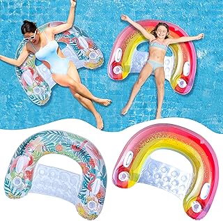ARefugen 2 Pack Inflatable Pool Floats - Blow up Lounge Chair with Cup Holders in Glitter Flamingo & Rainbow Design for Adults Relaxing Swimming Pool Beach Lake Party Summer Water Fun