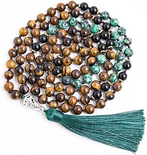 Hovaete 108 Mala Prayer Beads Necklace Natural Stones Meditation Yoga Jewery 108 Hand Knotted Japa Mala Beaded Long Tassel Necklace with Tree of Life Pendant for Men and Women (Yellow Tiger Eye+Black
