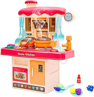 مجموعة ألعاب مطبخ للأطفال من فانتاستيك كيدز، 31 قطعة من إكسسوارات ألعاب المطبخ للعب التظاهري، مجموعة ألعاب مطبخ صغيرة بأضواء وصنبور مياه بخار، أصوات واقعية (بينك)