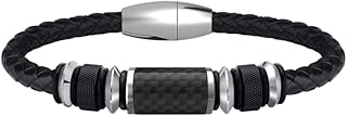 COOLMAN Leather Bracelet for Men Stainless Steel Bracelet with Carbon Fiber Bead Magnetic Clasp 8.5 inch, 8.5 inch, Leather Stainless Steel carbon fiber