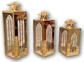 Home Ramadan Décor - Set of three golden lanterns in various sizes, crafted to add a warm festive glow to rooms, easy to place on shelves, tables or mantel, includes hanging hooks for ambiance.