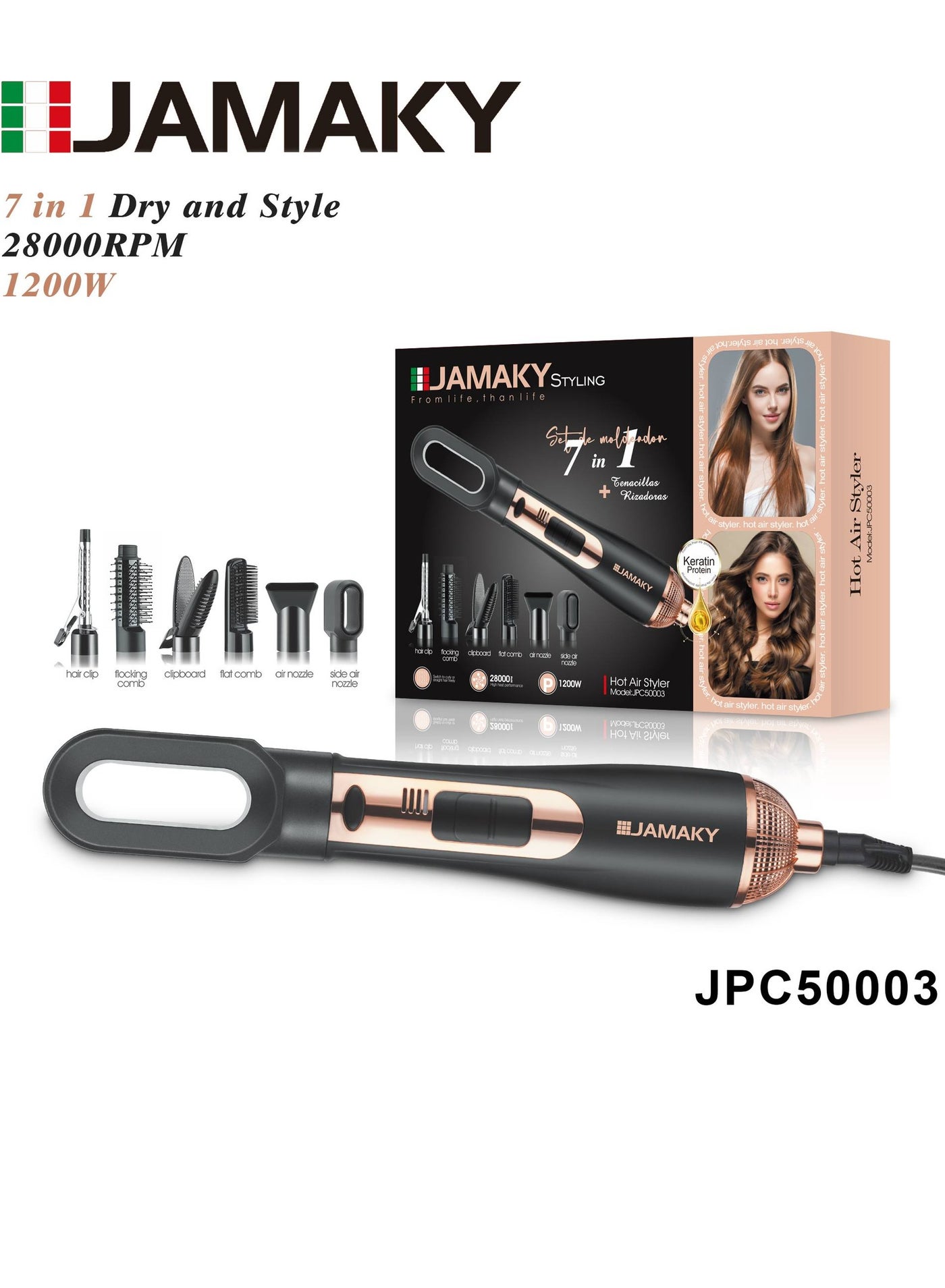 hot air styler , 1200w power of a dryer with Italian technology , JPC50003 volume of a styler with 7 pieces , 3 gear setting / lightweight and easy use