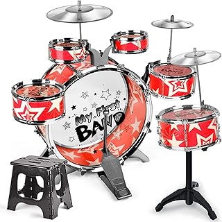 مجموعة طبول الجاز مكونة من 6 قطع مع مقعد قابل للطي ودواسة وصنج وعصا طبل، آلة موسيقية للأطفال الصغار والمبتدئين من ايكام