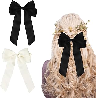 FEXPDL Hair Bows Clip 2 Pack Black White Clips with Long Silky Satin, Large French Hair Bow for Girls and Women (Black, Beige)