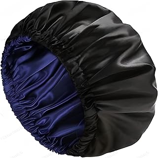 Double Layer Silk Satin Bonnet Reversible Bonnet Comfortable Elastic Headache Free Premium Quality Bonnet with Scrunchie Gift (Black+Navy)