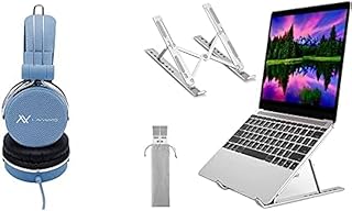 L'avvento Laptop Essentials Bundle ( (HP06L) Headphone Stereo Golden Plug With 40mm Speaker Driver - 1.5M - Blue + Adjustable Laptop Stand, Portable Aluminium Laptop Riser Laptop Holder for Desk)