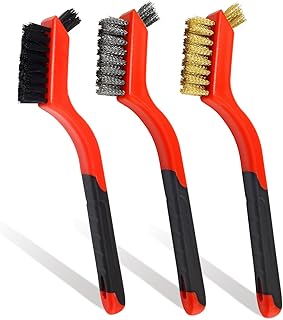 Moicstiy 3Pcs Mini Wire Brushes, Small Wire Brush Set Brass/ Stainless Steel/ Nylon Brushes for Cleaning Paint Scrubbing, Rust, Dirt (Red Handle)