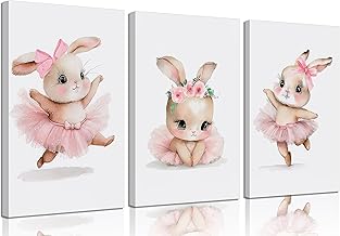 3 Pcs Pink Bunny Canvas Wall Art for Nursery Baby Room Cute Posters Prints Wall Decor Pictures Pink Preppy Dress Rabbit Ballet Paintings Artwork for Girls Room Bedroom Home Decoration