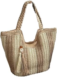 Handwoven Straw Beach Tote Bag with Tassel, Striped Pattern, Braided Handle, Available in Natural
