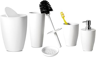 Pure Plastic Bathroom Accessory Set, Consist of 5 Pieces(Basket 7.5 Liter, Soap Dispenser, Soap Holder, Toilet Brush, Toothbrush Holder) (White)