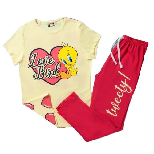 Generic - بيجامة بناتي من قطعتين تيشرت اصفر به رسمه وبنطلون احمر