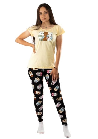 Generic - بيجامة حريمي من قطعتين تيشرت نص كم بيج وبه رسمه وبنطلون اسود به رسمه