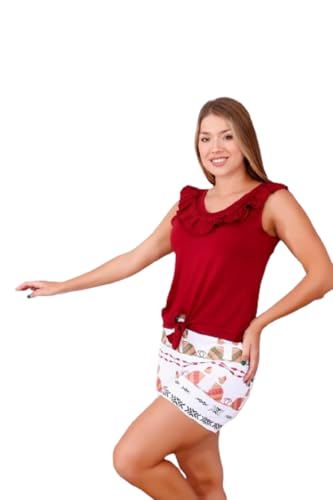 Generic - بيجامه صيفي حريمي قطن ليكرا قطعتين ( بلوزه كت و هوت شورت) (احمر نبيتي)