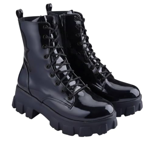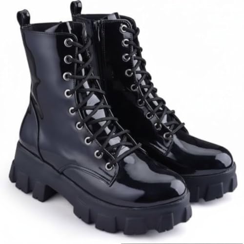 Generic - حذاء حريمي نصف بوت نسائي ، بيده حريمي برباط ، أسود نعل سميك ، بسحاب جانبية