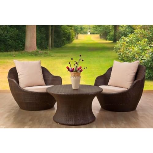 - طقم أثاث خارجي: يتضمن كرسيين مريحين بتصميم انسيابي وطاولة قهوة دائرية مثالية للفناء أو الحديقة أو الشرفة.