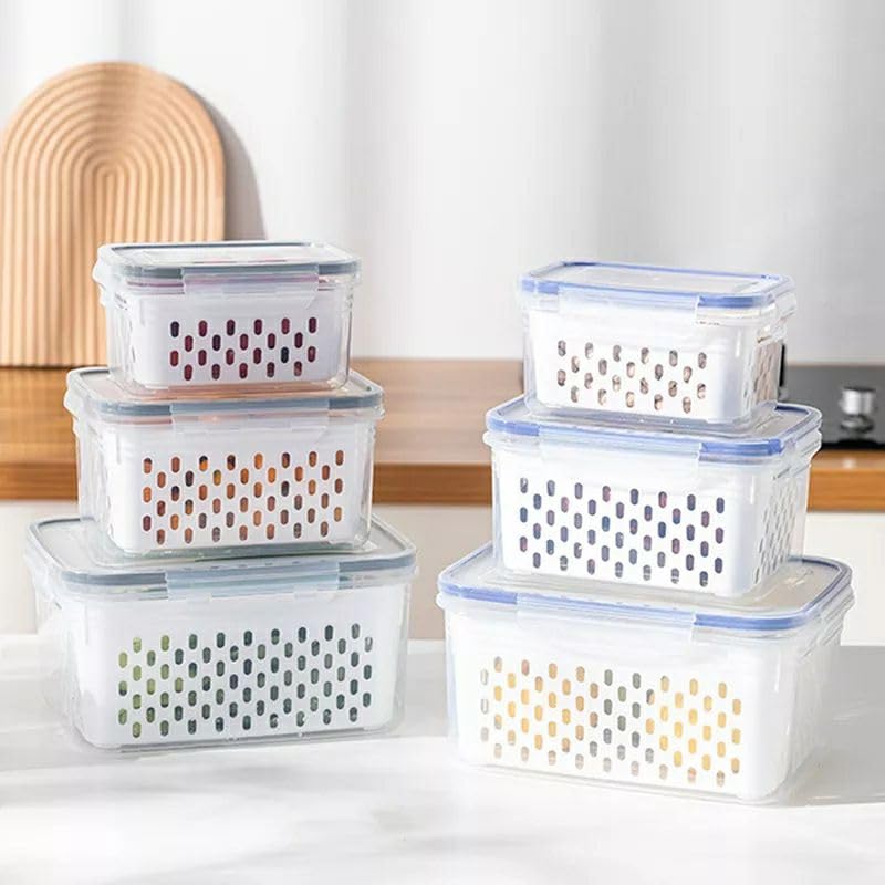- Latest Fruit & Vegetable Storage Technology As Long As Possible 3-Piece Set Lock Strainer Can Set Healthy Plastic Material With Plastic Strainer For Liquidation Vegetables Or Fruits Fiddle To Swirl Vegetables Or Fruits Fridge Non Contoured The Box Water Sealed With The Same Content Of Package Plastic Cover With Gauge Sealed No-Spill Silicone