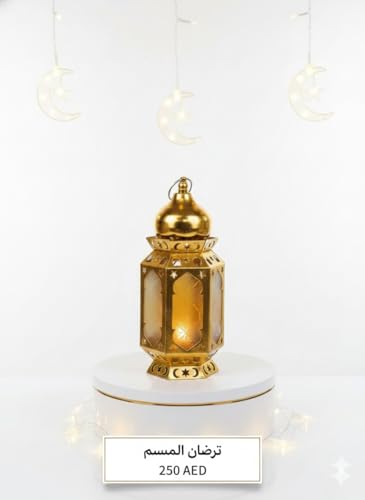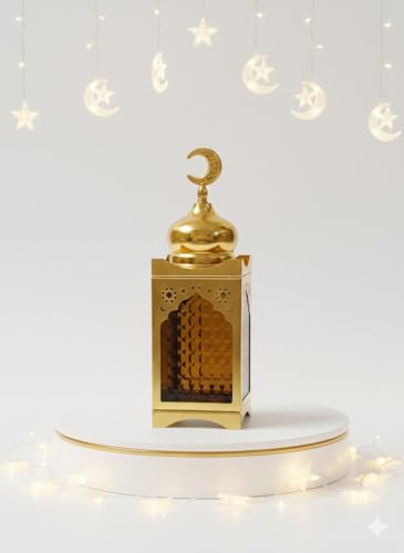 Generic - فانوس رمضان معدني اضاءة زجاج ذهبي تصميم جامعة وقبه وهلال بزينة اسلامية ورسمه هلال ونجمه خماه عاليه الجوده ديكور مناسب للمنزل والمكتب