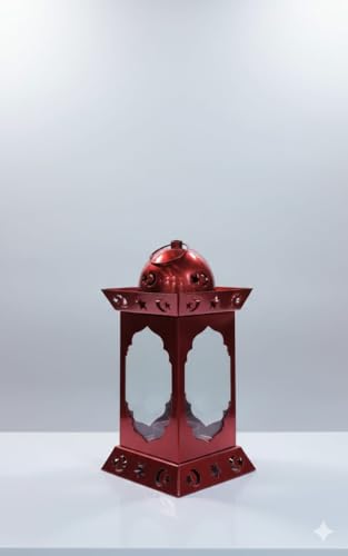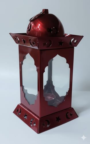 Generic - فانوس رمضان معدن بزجاج قبه مدور احمر غامق مع وحده اضاءه بشمعه ورسمه هلال ونجمه خمات عاليه الجوده مع حلقه دعبى فانوس على شكل مسجد