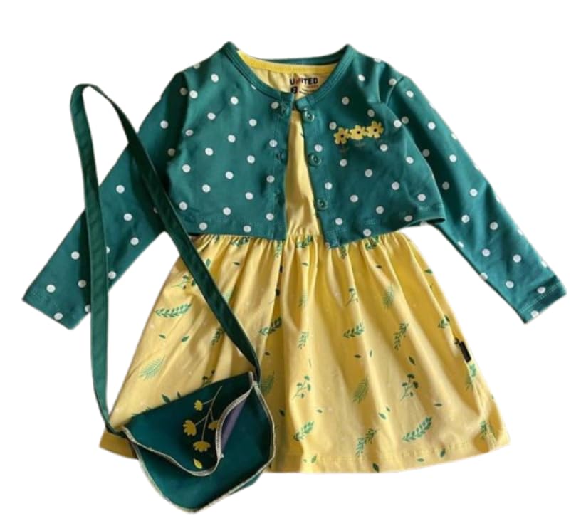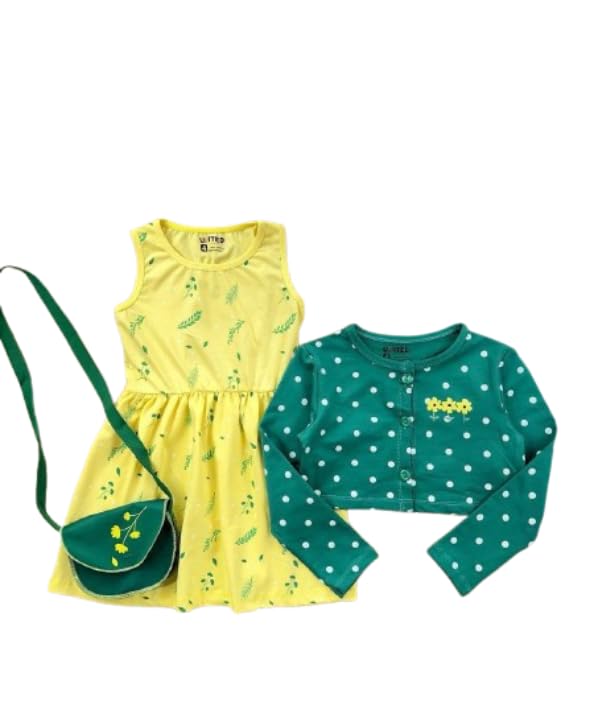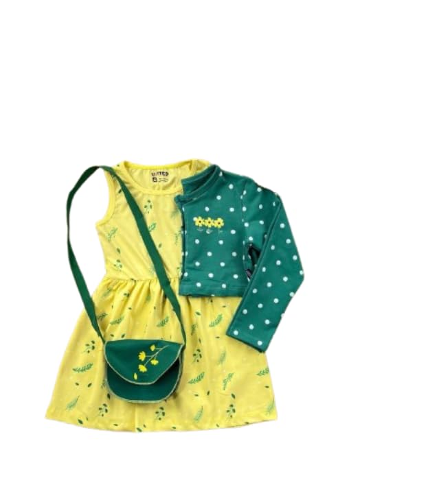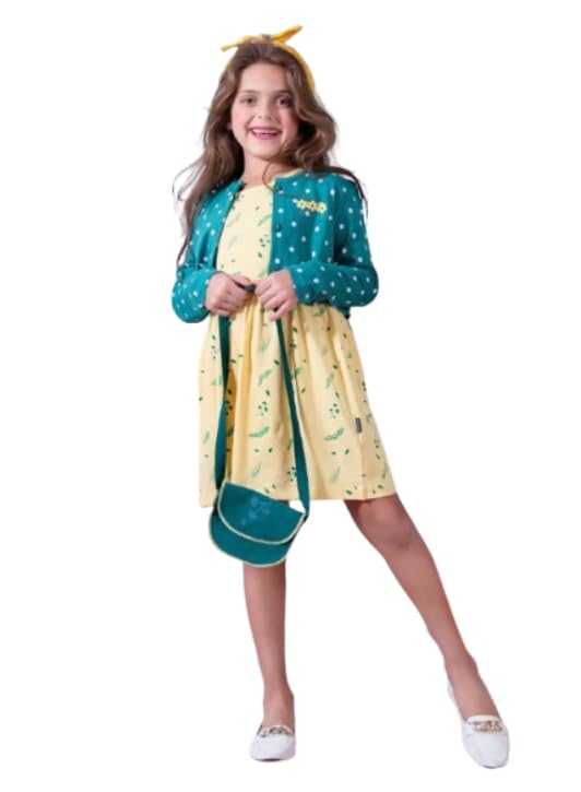 Generic - فستان بناتي ثلاث قطع فستان اصفر به رسومات صغيره وبليرو اخضر وشنطه خضراء خامه قطن سنجل ليكرا