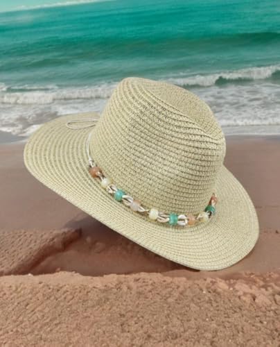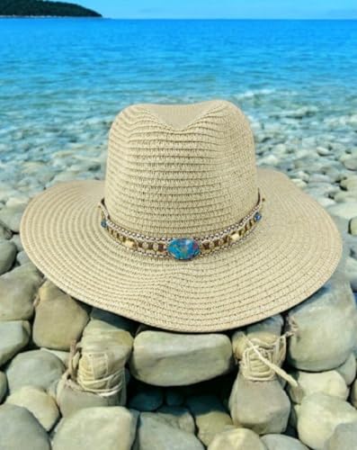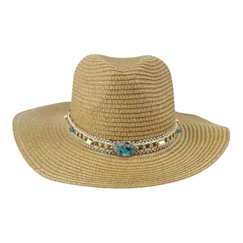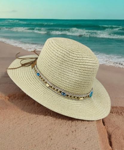 عام - قبعة شمس نسائية من القش مع شريط مزين بالأحجار الفيروزية، لون بيج