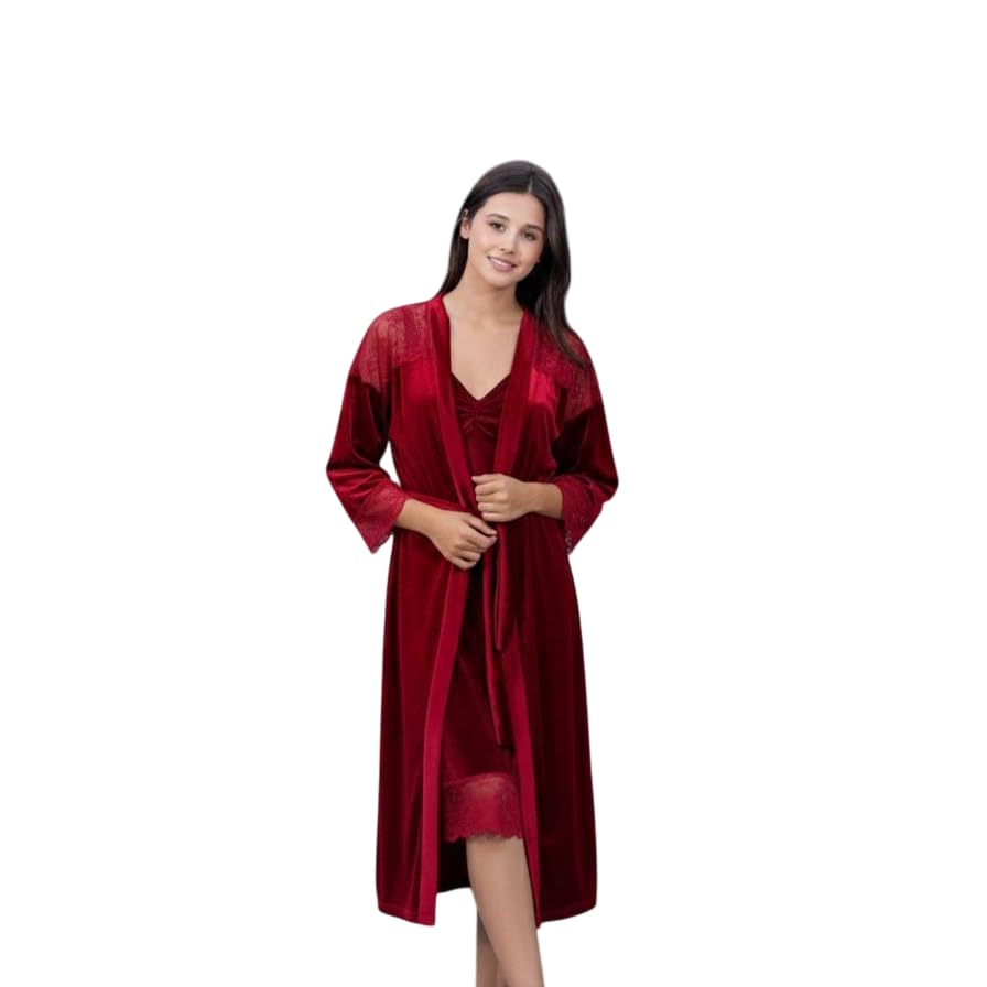 Generic - كاش شتوي قطيفة حمالات مطمة بدانتيل من اطراف و روب طويل مطعم بدانتيل من الكتفين و الأكمام للنساء