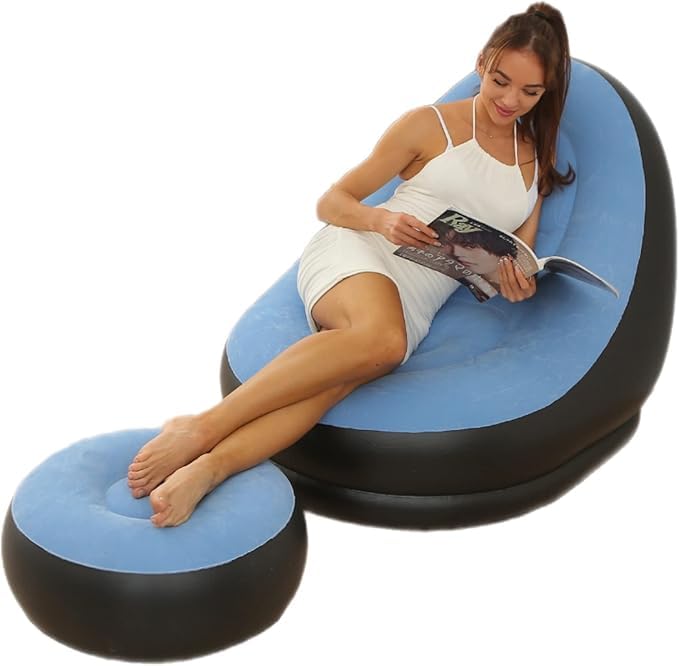 Generic - كرسي استرخاء قابل للنفخ مع مسند للقدمين ومضخة هواء، مثالي لغرفة المعيشة أو النوم. مريح وموفر للمساحة، مناسب للقراءة، الألعاب، والاسترخاء داخل المنزل وخارجه (اسود ×ازرق)