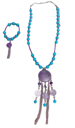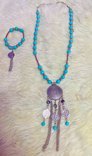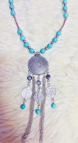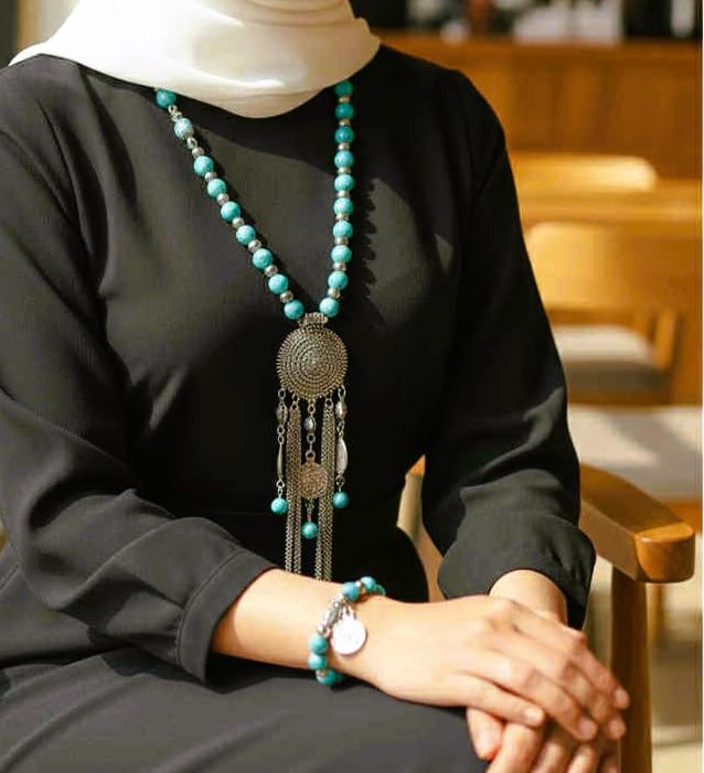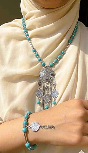Generic - كوليه طويل من أحجار الفيروز (ومعه اسوره) مزود بدلايات مزخرفه وبها سلسلة للتحكم بالطول