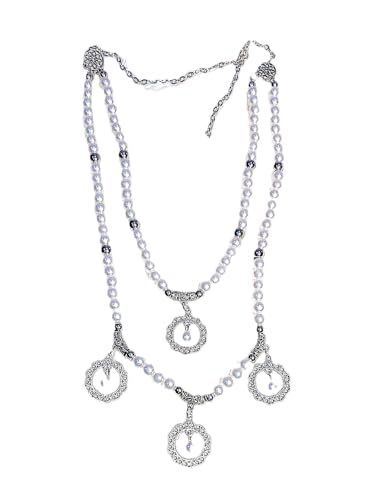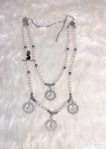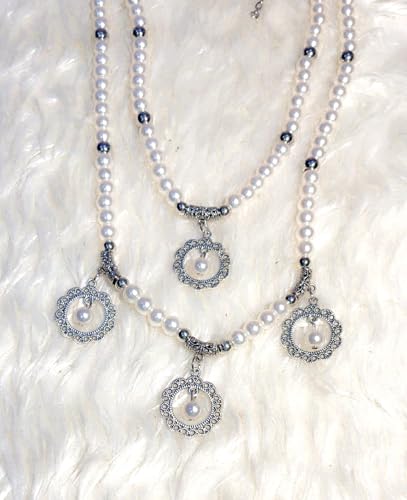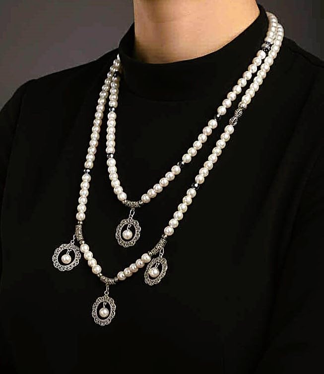 Generic - كوليه طويل من اللولى الأبيض مزود بدلايات مزخرفة مطلية بالفضة
