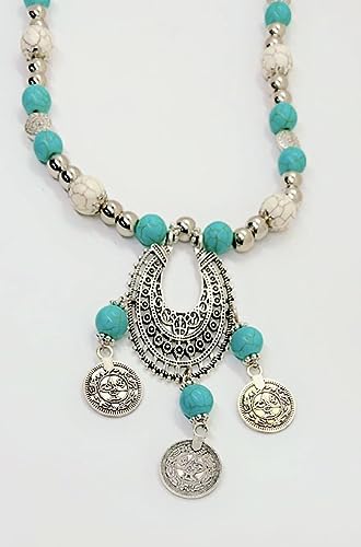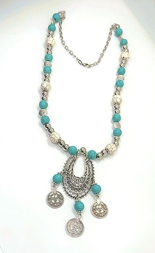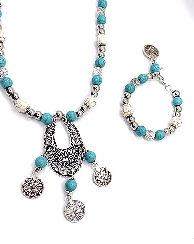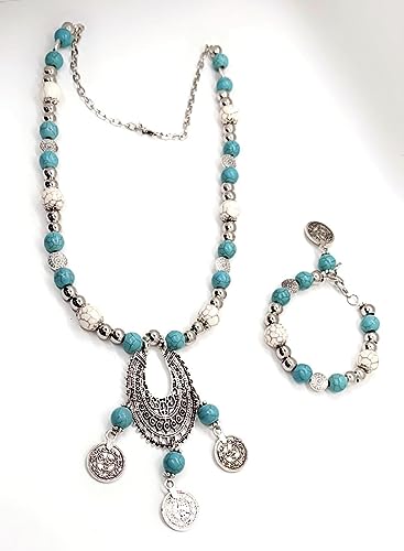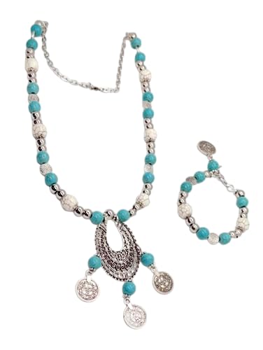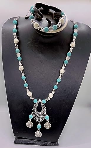 Generic - كوليه طويل من احجار الفيروز (ومعه وأسوره ) وبها سلسله للتحكم بالطول، للنساء