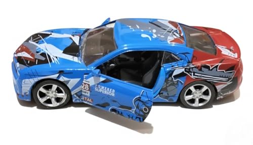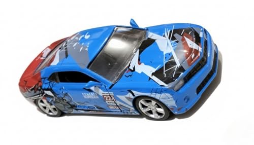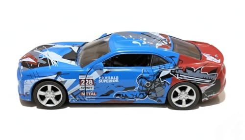 - ١) تصميم مميز: سيارة رياضية معدنية مصغرة بلون أزرق جذاب مع تفاصيل باللونين الأحمر والفضي
