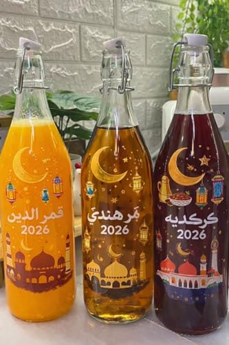 عام - زجاجات زجاج بكبسولة معدنية مع كتابه عربية، سعة 1 لتر، عبوة من قطعتين، تصميم رمضاني2026