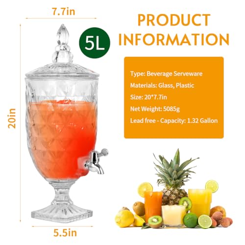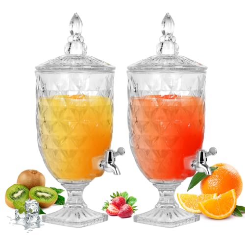 Pickei - 1.3 Gallon Glass Drink Dispensers - 2 Pcs Vintage Crystal Iced Beverage Dispenser with Stand &Spigot for Parties Wedding - Wide Mouth Beverage Containers for Juice Tea