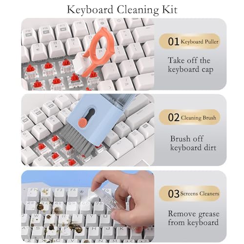 - 【Keyboard Cleaning Kit】Keycap Puller and High density brush clean Keyboard more convenient. Use a keycap puller to easily pull the keycaps off the keyboard without damaging the keyboard, then use a cleaning brush to clean the keyboard before reinstalling the keycaps.(note: only for trapezoidal keycaps, Before disassembling the keyboard, take a photo to save the alphabetical order to prevent incorrect installation)