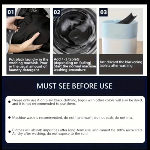 - ⚠️ IMPORTANT USAGE NOTE: Designed strictly for plain solid black garments. Please do not use on clothes with white logos, embroidery, or colored patterns, as these areas will also be darkened. Recommended for machine wash only (do not hand wash or soak).
