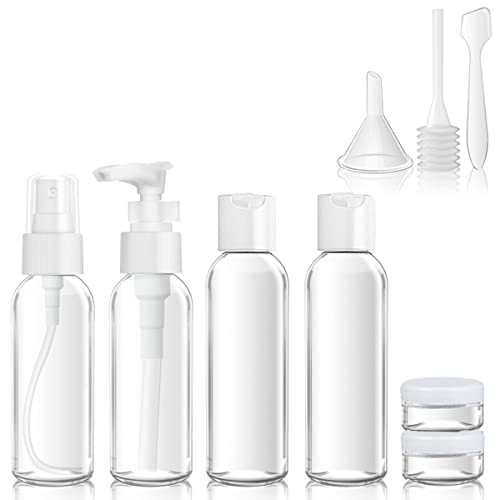- BEST TRAVEL COMPANION - The travel bottles set you will need most when traveling. You will get 10 various items, 2 press-cap bottles (50ml), 1 spray bottles (50ml), 1 pump bottles(50ml), 2 cream jars (10ml), 1 spatula, 1 funnel,1 pipette, 1 clear bag.