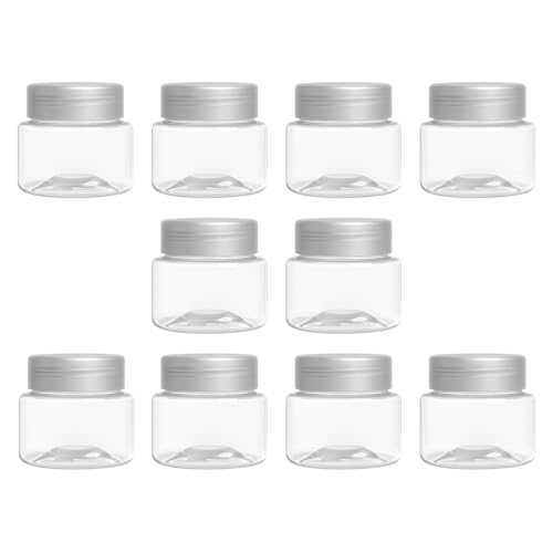 artistic - 10 قطع برطمان بلاستيك لون ابيض شفاف مقاس 50 ملي - قطر 3.7 سنتي غطاء الوان مختلفة فوارغ بلاستيك عالي الجودة صحية لإعادة التعبئة برطمان تخزين - من (فنوني) (غطاء فضي)
