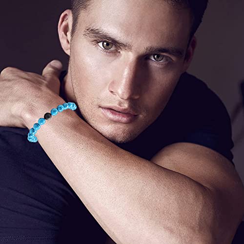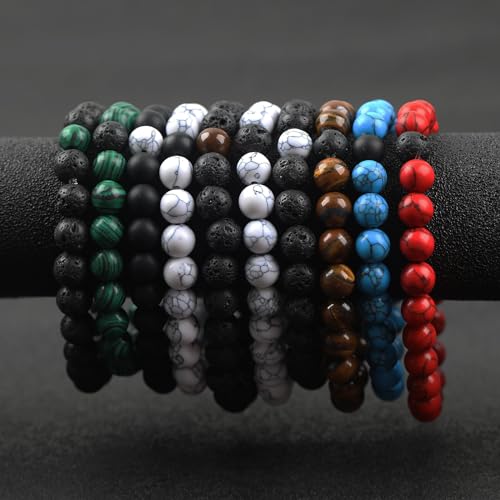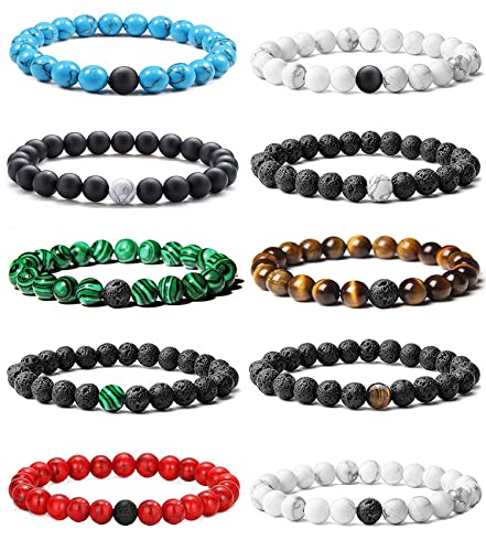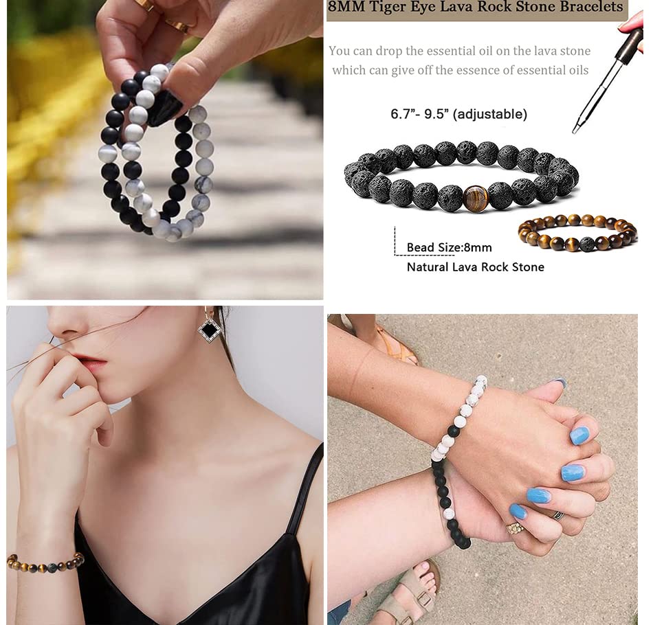 VELESAY - 10 Pieces Natural Gemstone Bracelets for Women Men Lava Stone Beads Bracelets Beads Lava Tiger Eye Bracelet Natural Beads Lava Bracelet Distance Couple King Queen Bracelets Set Adjustable