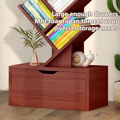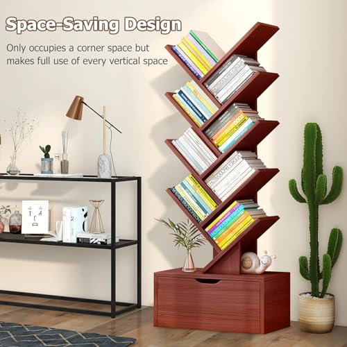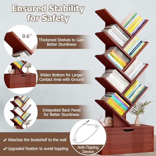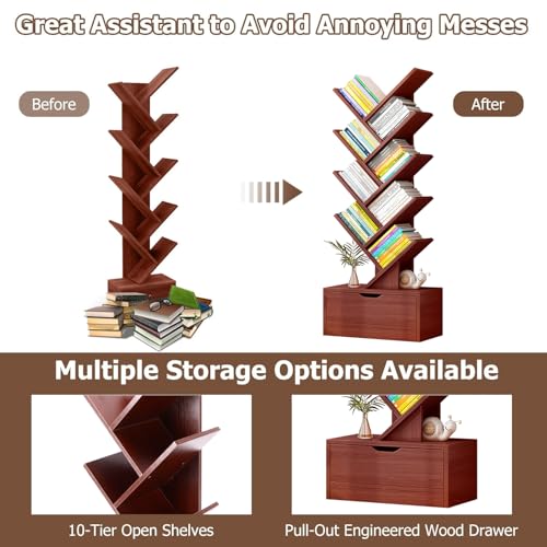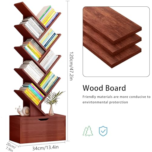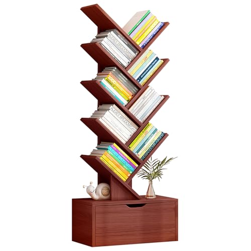 LEQI - رف كتب على شكل شجرة من 10 طبقات مع درج، رف كتب قائم على الارض، رف تخزين كتب خشبي طويل مع جهاز مضاد للسقوط وقاعدة مرتفعة، لغرفة المعيشة وغرفة النوم والمكتب