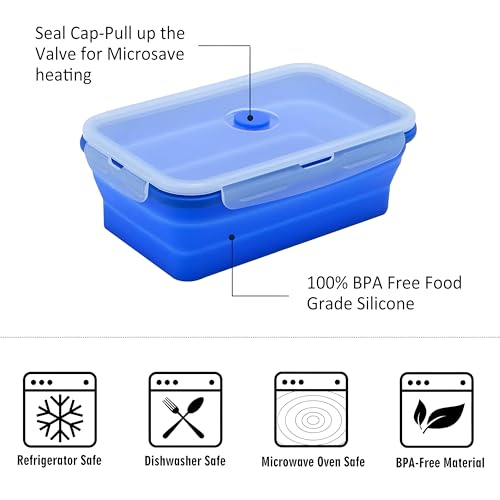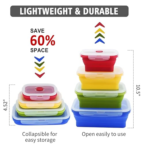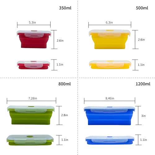 - Space saving This silicone lunch box set is collapsible and easy to fold Each can be folded to 1.25 inches (1/3 of its original size) It can help you save 60% of space so you can easily organize it. There is a air vent on the covers for microwave heating. The premium closed ring and clasp are leak-proof and can keep your food fresh.