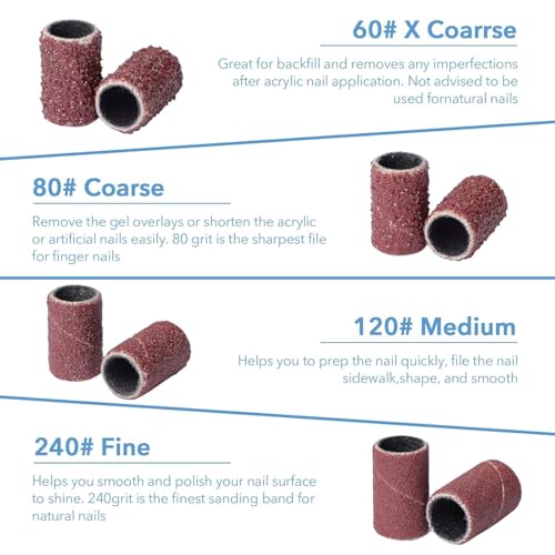 - 100 Pcs Nail Drill Bits Sanding Bands for Nail Drill:80#Grit File Set :Our sanding bands are designed with durable material. 180# comes with a smooth surface and it will perfect on the natural nail and cuticle with your file's low speed. The sanding bands old and new packages ship randomly.