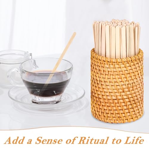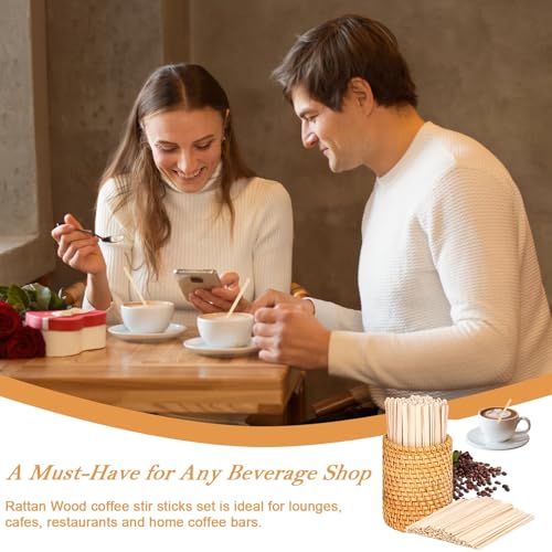 - ⭐【Convenient & Hygienic】These disposable wooden beverage stirrers require no washing—simply use and discard. The rattan holder is durable and long-lasting, keeping your coffee area tidy and time-efficient.