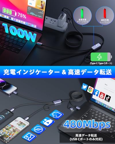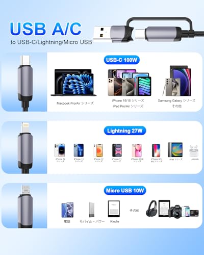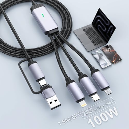 - 【Max 100W Fast Charging】Fully compatible with PD 3.0/2.0 and QC 3.0/2.0 fast charging protocols. This multi-cable supports up to 5A current with 5V, 12V, and 20V power for fast charging. USB C Port Power: 100W, Lightning Port Power: 27W, Micro USB Port Power: 10W USB PD Charger can charge Samsung S22 up to 50% iPhone 16 up to 71% in 30 minutes