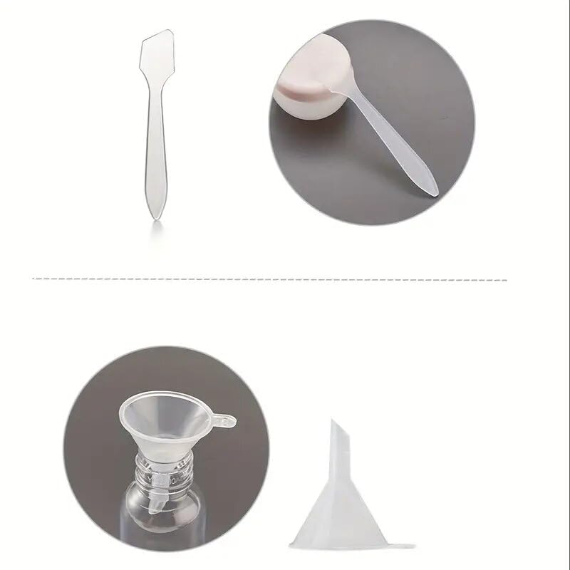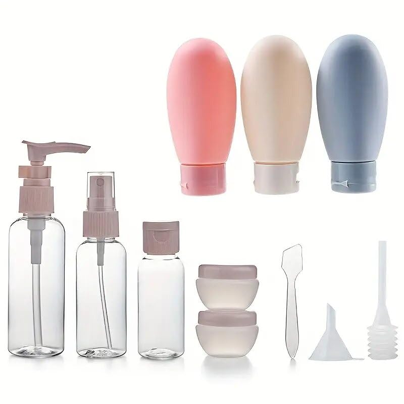 - COMPLETE 11PCS KIT: 3 Flexible Silicone Packs, 3 Plastic Bottles (Spray+Disspencer+Regular Bottle), 2 Cream Round Packs, 1 Funnel, 1 Straw, 1 Clear Plastic Bag.