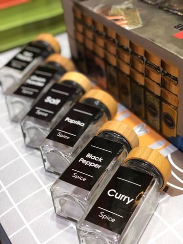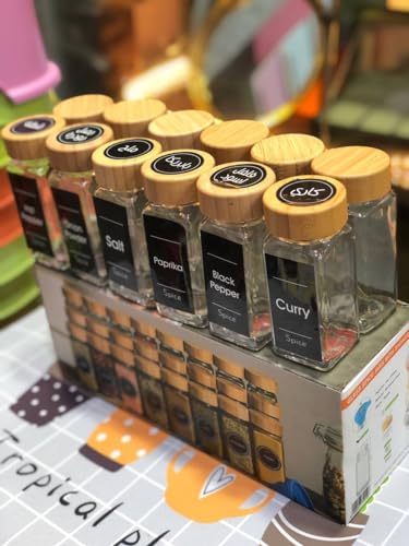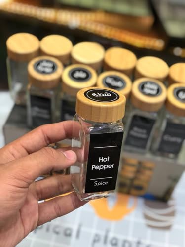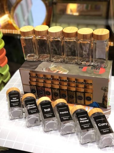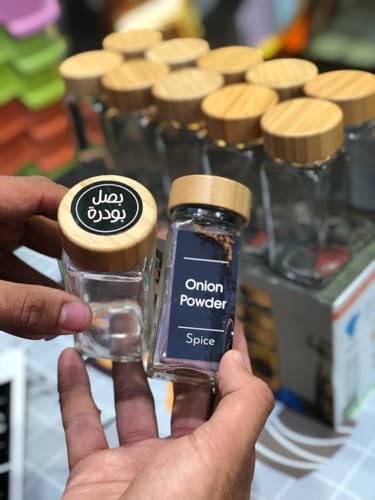 Generic - طقم توابل 12 قطعه زجاج شفاف نقى بغطاء خشب بامبو سعه البرطمان 120 مللي ارتفاع 11 سم مع 36 قطع استيكر اسماء التوابل