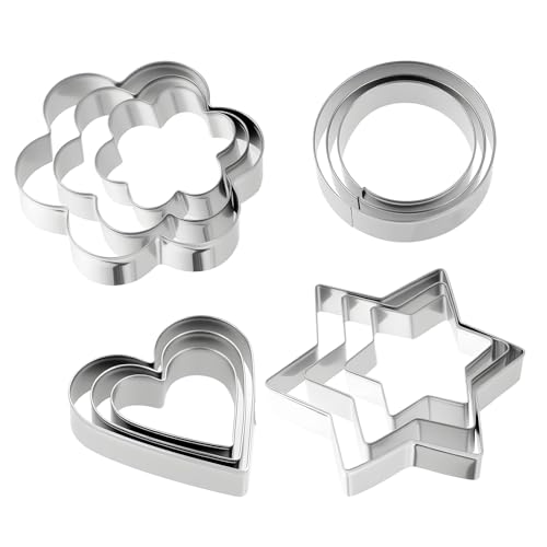 Eldraqth - قطاعات الكوكيز والفاكهة من الفولاذ المقاوم للصدأ، قالب كيك فوندان على شكل قلب وزهرة ونجمة وأشكال دائرية، قطاعات معدنية للخبز - 12 قطعة