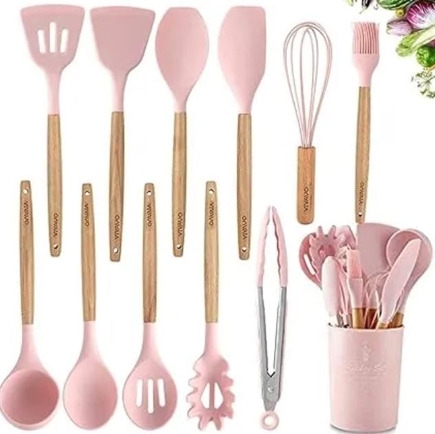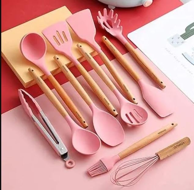 Generic - 12-Piece Pink Silicone Spatula and Utensil Set with Wooden Handles – Heat-Resistant, BPA-Free Nonstick Cooking Tools – Durable, Stylish Kitchen Utensils for Baking, Cooking & Serving