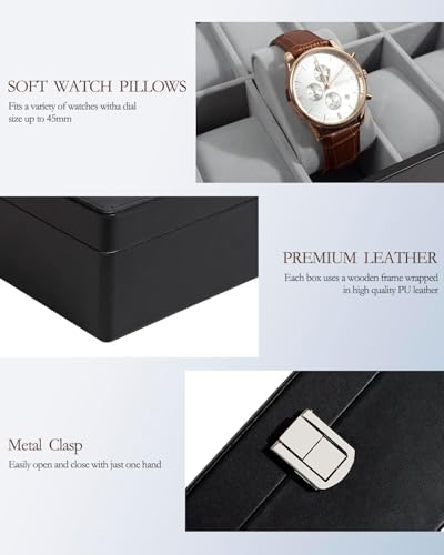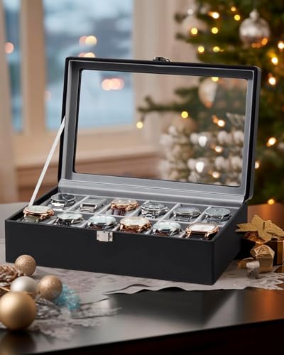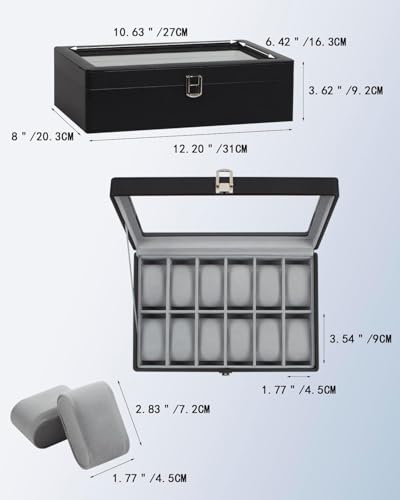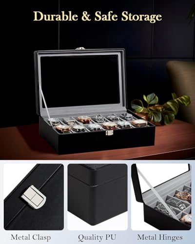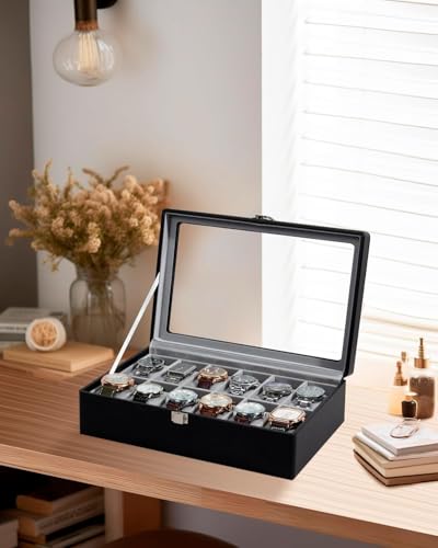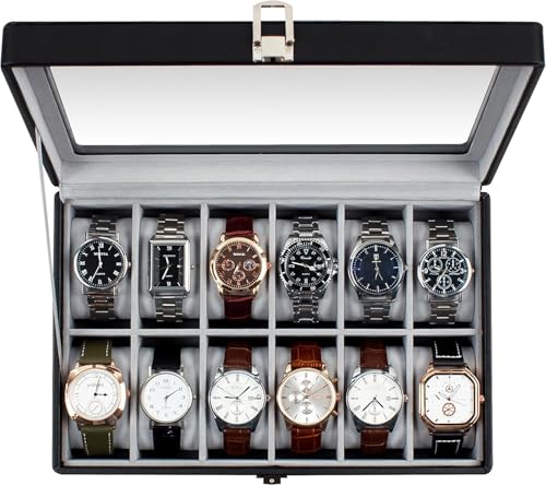 Generic - 12 Slots Watch Box with Real Glass Large Lid, Watch Organizer with Removable Watch Pad, Black PU Leather Display