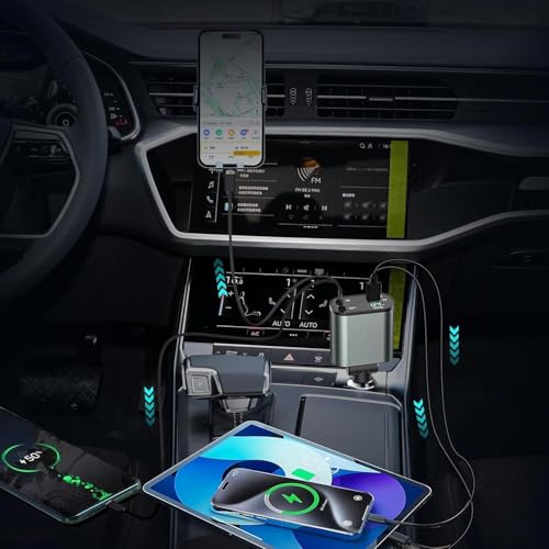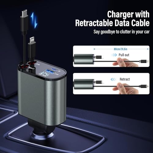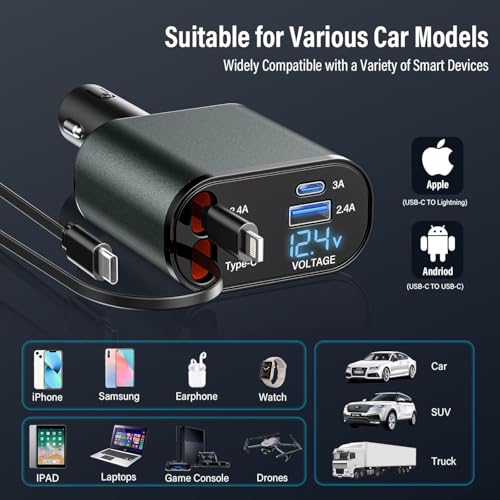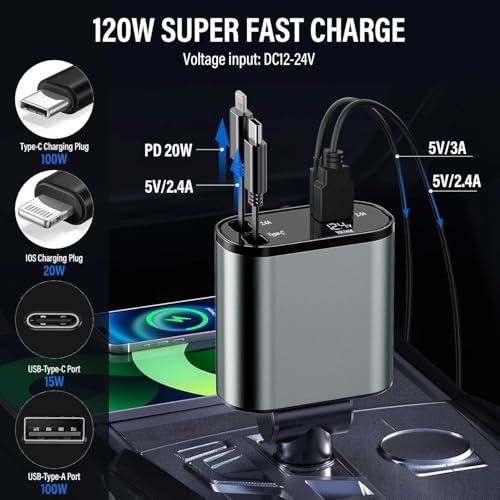 Generic - 120W Retractable Car Charger with Built-in Cable (USB-C & Lightning) and 2 USB-A & Type-C Ports – PD & QC Fast Charging with LED Power Display – Compatible with 12/24V Vehicles